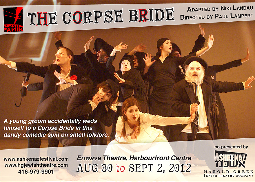 In a corner of 19th century Eastern Europe, in a time when all the Jewish brides have mysteriously disappeared, Gumpcha and Pinkel are about to be married…but not if either one has anything to say about it. Based a classic folktale by famed medieval scholar Rabbi Luria, The Corpse Bride is full of eerie theatrical images, dark comedy, and colourful characters. Theatre PANIK’s highly original production combines physical theatre with a stunning original musical score by John Gzowski. Paying tribute to Yiddish theatrical tradition, silent film and cabaret through live music, stylized movement, and projections, The Corpse Bride features a wonderful cast of fourteen actors, including former prima ballerina Evelyn Hart. An irreverent, 21st-century tour de force of new Jewish theatre. |